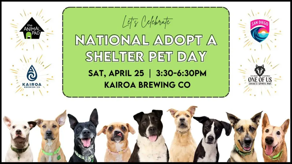 We’ll be hanging out at Kairoa Brewing Co in partnership with One of Us Sports Bar – San Diego’s new home for women’s sports. The Wave’s away game starts at 5:45, so come early to meet our adoptables and grab your table, then stay for the watch party! Let’s see how many pups we can get into furever homes on National Adopt a Shelter Pet Day!