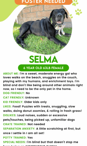 Temp fostering is a great way for people who work long hours, travel frequently, or otherwise are unable to care for a pet long term to get some doggie love in their life and do some good while they’re at it! Dogs may need temp fosters because their regular foster is out of town, they are between fosters, or they otherwise need a safe place to go for a shorter period of time. Our matchmaking team will provide a list of dogs with upcoming temp foster needs and after reviewing their bios and the dates they need care, you can let us know if there is a pup you are interested in helping!