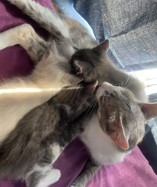 - Banana Cream (grey tabby) is the most cautious but quickest to purr.