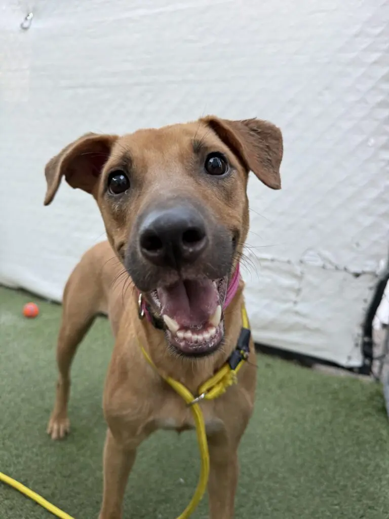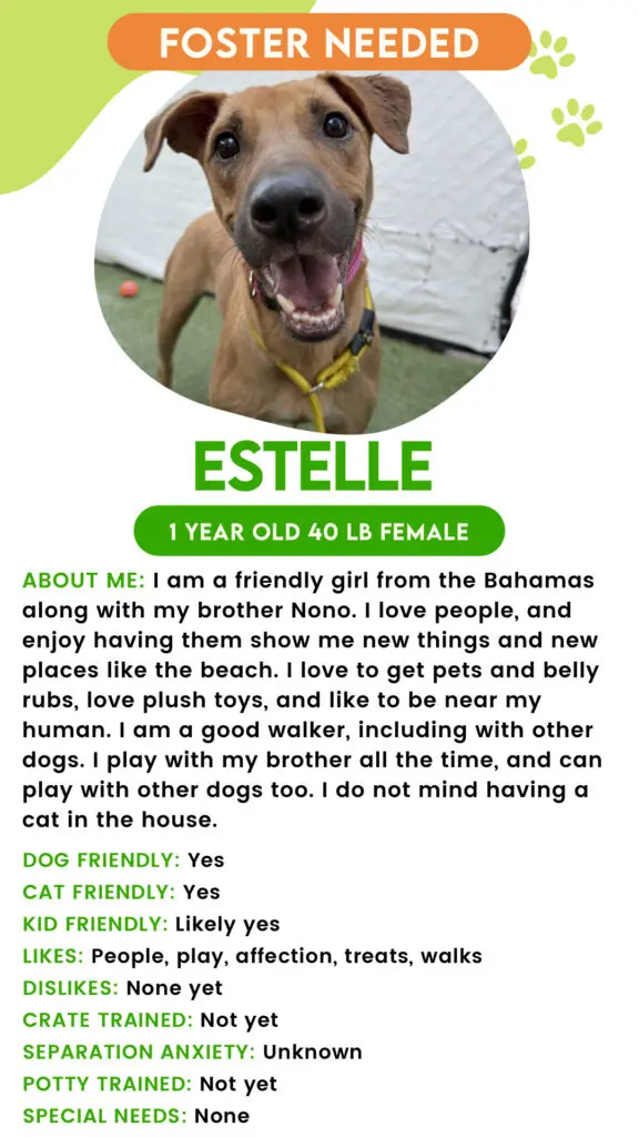 Estelle is a recent arrival at TAP all the way from the Bahamas, along with her brother Nono. They even got to fly in a private jet! We are still learning about Estelle, but she has proven to be a favorite at HQ. Friendly with humans, dogs, and cats. Playful and loves plush toys and doing tug of war. Also loves pets, scratchies, and belly rubs. Good walker, even alongside other dogs. Most of the videos include her brother too as they play together.