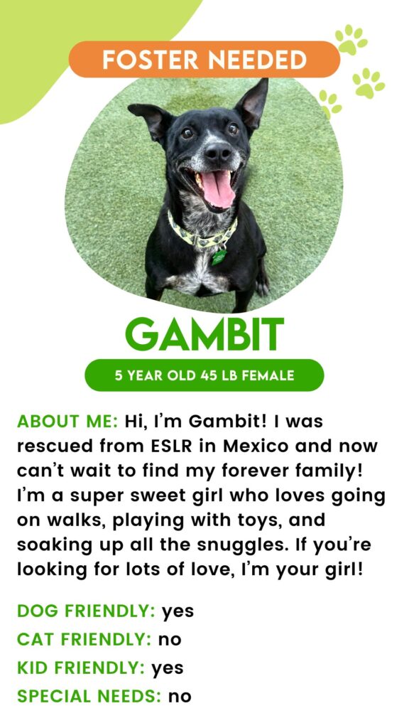 Checkmate! Oops, I mean… hi there! My name is Gambit, I’m a 5-year-old, 47-pound mixed-breed cutie. I’m a quiet queen, learning the game one move at a time. I came from the ESLR “shelter” in Mexico, and while I’m safe now, I’m gaining confidence as I explore the world. Don’t worry, we’ll be making moves together in no time!
