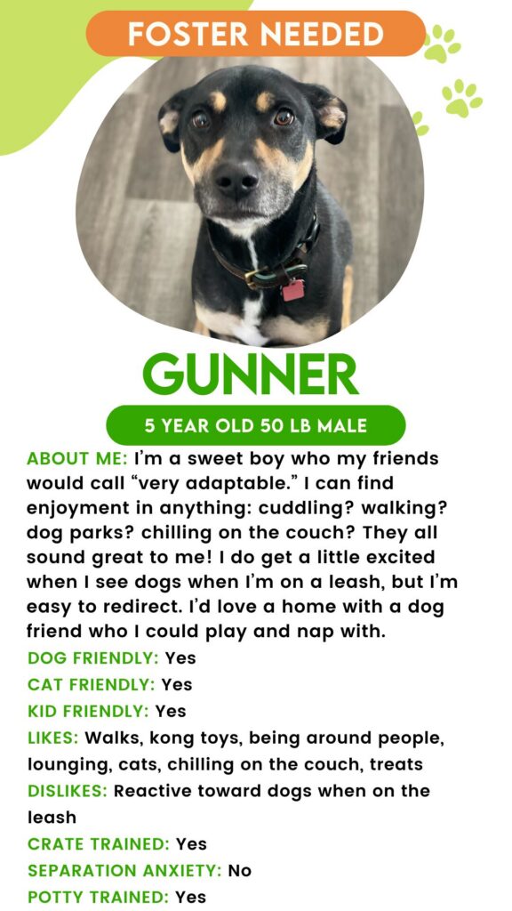 Hi there! My name has been Ivy, and it’s also been Gunner, and honestly? I’ll happily answer to whatever name you give me as long as it comes with love! I’m a 5-year-old, 45-pound “mutt of many talents,” and after spending my whole life with one family, I was surrendered when they had a new baby. I’ve been with my foster for a month now, settling in and showing what a sweet, people-loving boy I am.
