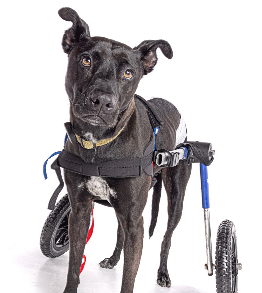 I’m an outgoing boy who loves other dogs and playing with them. I bark to say hello and just want their attention! I have plenty of supervillain energy (aka puppy energy) but my play is limited with my legs. I love chewing on toys, bones, and being a loyal boy! I haven’t met any cats, so I’m not sure what I think about them yet. I hope we’d be buddies! What I love most of all is attention and affection from my people. I’m a big softie– don’t tell the other “bad guys.”