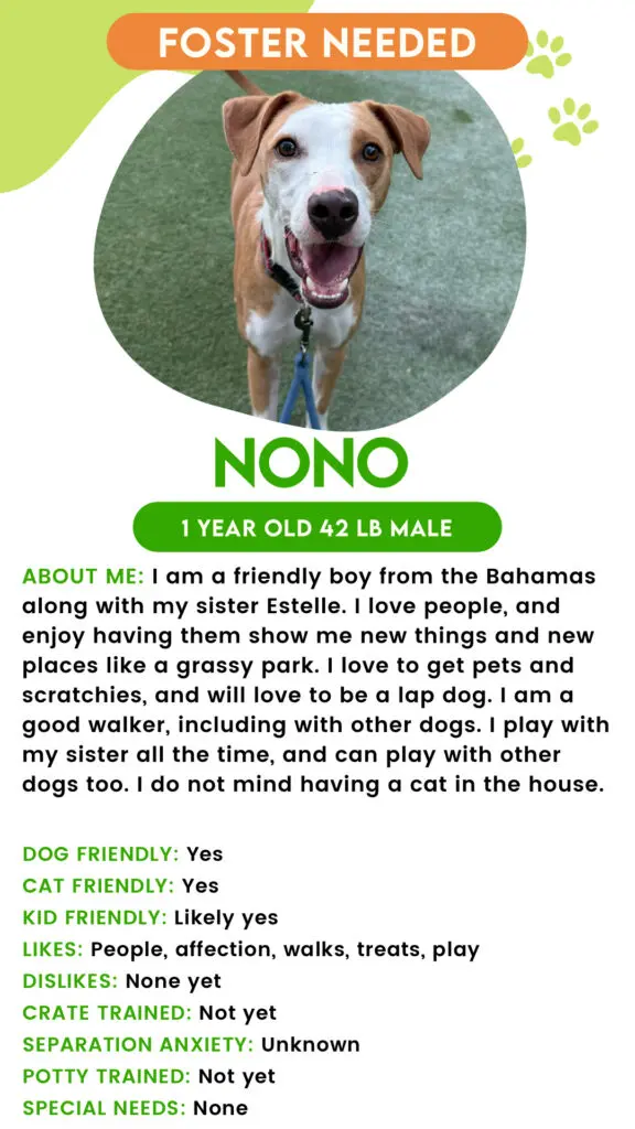 Nono is a recent arrival at TAP all the way from the Bahamas, along with his sister Estelle. They even got to fly in a private jet! We are still learning about Nono, but he has proven to be a favorite at HQ. Friendly with humans, dogs, and cats. Playful and loves plush toys and doing tug of war. Also loves pets, scratchies, and belly rubs. Good walker, even alongside other dogs. Most of the videos include his sister too as they play together.