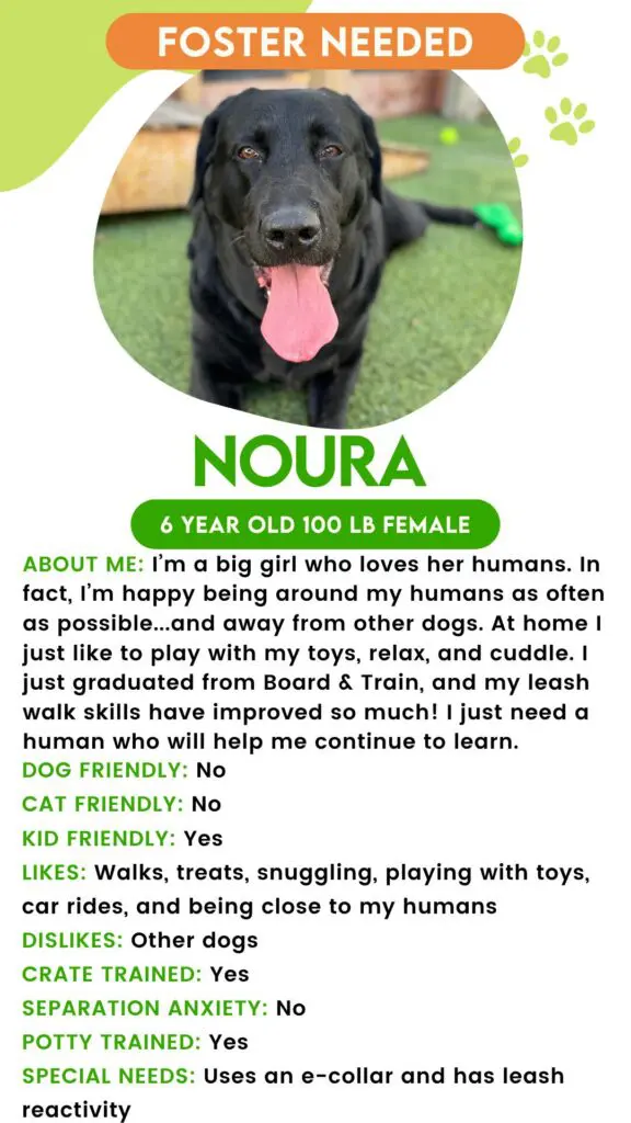 Hi there! I’m Noura, a 6-year-old Lab mix weighing in at 110 lbs. I’m potty trained and crate trained. I have a past that wasn’t so easy, and I was rescued from the SEACCA shelter in San Bernardino, CA, where I was on the euth list. But now, I’m living a much better life thanks to TAP!