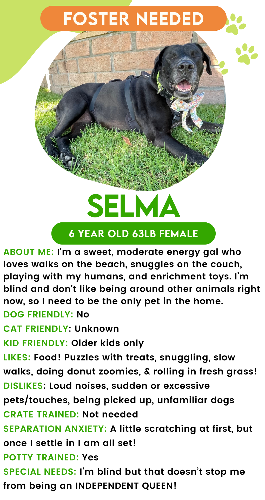 Hi, friends! My name is Selma, and I’m a 6-year-old Spaniel Mix female, weighing in at 65 pounds. I’ve been hanging out with my foster parents since being rescued by TAP, and I can’t wait to find my furever home!