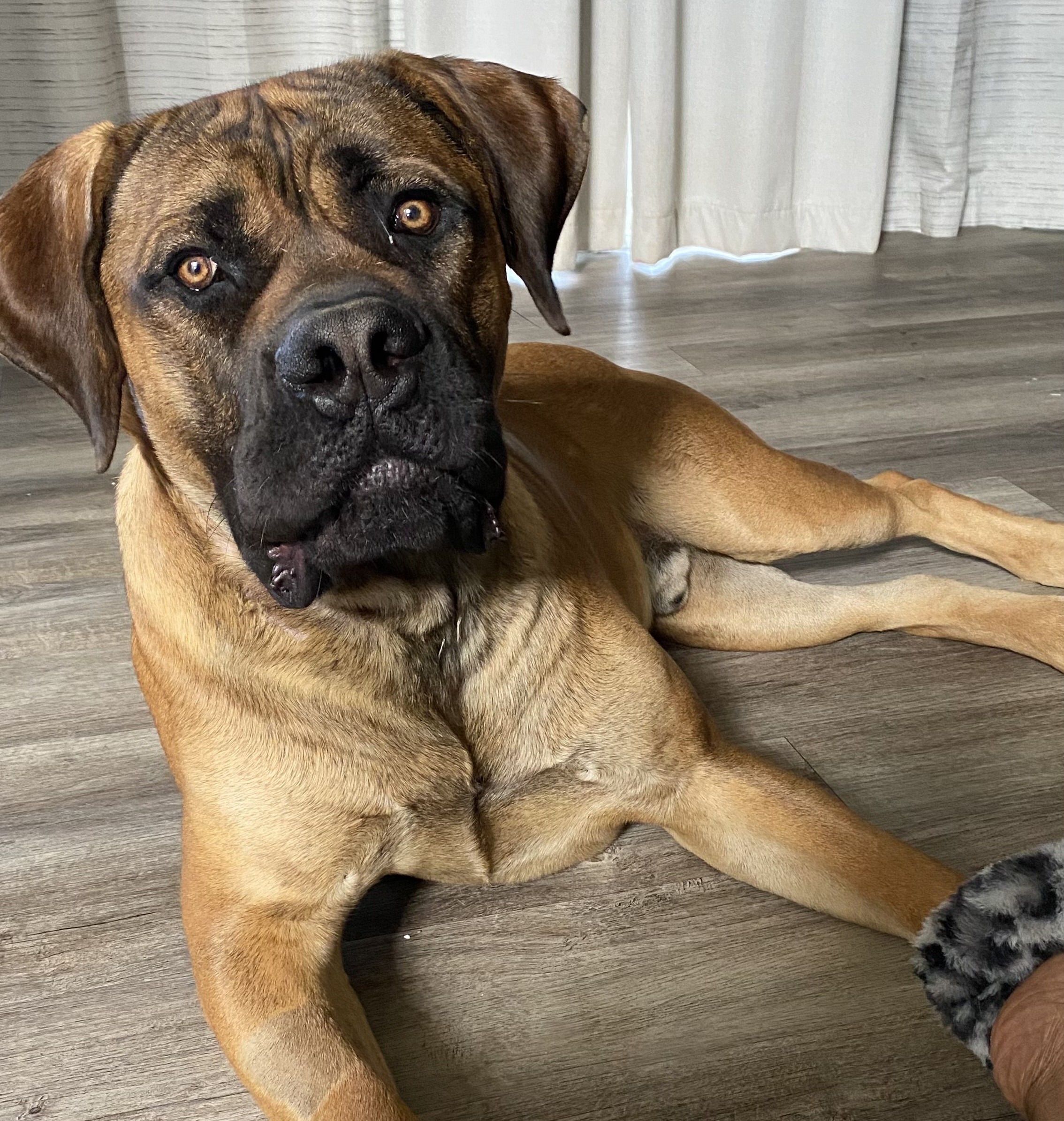 I am Zeke, a big boy at 150 pounds of love and devotion! I am a purebred Boerboel, and this means I am loyal and intelligent and enjoy learning new things!